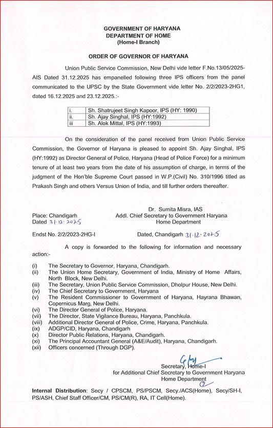 प्रदेश सरकार ने 1992 बैंच के IPS अजय सिंघल को हरियाणा का नया डीजीपी नियुक्त किया