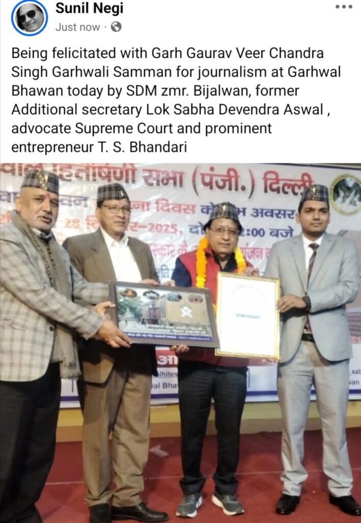 नई दिल्ली (ईशान टाइम्स)। वरिष्ठ पत्रकार, यूकेनेशन न्यूज़ के संपादक, उत्तराखंड पत्रकार मंच के अध्यक्ष और पूर्व में प्रेस क्लब ऑफ इंडिया के निदेशक सुनील नेगी को उत्कृष्ट पत्रकारिता के लिए प्रतिष्ठित गढ़ गौरव वीर चंद्र सिंह गढ़वाली सम्मान से सम्मानित किया गया। यह सम्मान दिल्ली में गढ़वाल, उत्तराखंड के निवासियों के सबसे बड़े प्रतिनिधि सामाजिक संगठन द्वारा आयोजित एक समारोह में दिया गया। इस संगठन की स्थापना लगभग 103 वर्ष पूर्व अविभाजित पाकिस्तान के क्वेटा में हुई थी और इसका मुख्यालय अब दिल्ली के पंचक्वीन रोड स्थित है। 28 दिसंबर को गढ़वाल भवन में आयोजित समारोह में पत्रकारिता, लेखन, कविता, संस्कृति, शिक्षा, अभिनय, फिल्म निर्माण, सामाजिक योगदान और जीवन के विभिन्न क्षेत्रों से जुड़े उत्कृष्ट व्यक्तित्वों को भी सम्मानित किया गया। वरिष्ठ पत्रकार सुनील नेगी, जो चार दशकों से अधिक समय से पत्रकारिता में सक्रिय हैं और उन्होंने कई पुस्तकें लिखी हैं, जिनमें 800 पृष्ठों वाली ‘उत्तरांचल हूज़ हू’ के दो संस्करण और ‘हैवोक इन हेवन’ (अंग्रेजी अनुवाद) शामिल हैं, साथ ही प्रिंट और डिजिटल मीडिया में हजारों समाचार और लेख लिखे हैं, उन्हें उत्तराखंड और राष्ट्रीय एवं अंतर्राष्ट्रीय महत्व के महत्वपूर्ण मुद्दों को निष्पक्ष रूप से उजागर करने के लिए अंग्रेजी और हिंदी में लेखन के लिए प्रतिष्ठित गढ़ गौरव वीर चंद्र सिंह गढ़वाली पुरस्कार से सम्मानित किया जा रहा है।